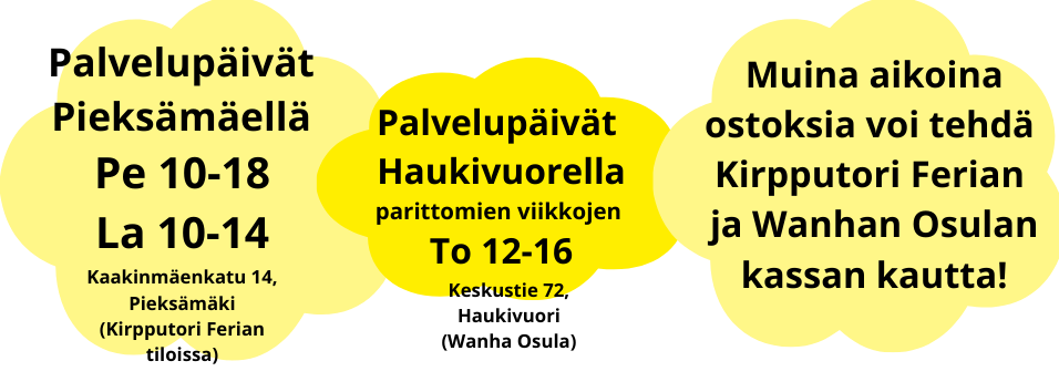 Uudesta Kirpputori Ferian kanssa samoissa tiloissa sijaitsevasta puodistamme löydät valikoiman koirien ruokia, herkkuja ja tarvikkeita. Myös kissoille ja kaneille on tarjolla valikoidut, suosituimmat tuotteet. Tuttuun tapaan saat meiltä tietenkin myös asiantuntevaa ja ystävällistä palvelua aina palvelupäivinämme eli pe 10-18 sekä la 10-15. Mahdollisista poikkeuksista aukioloihin ilmoitamme somekanavissamme (Instagram ja Facebook).